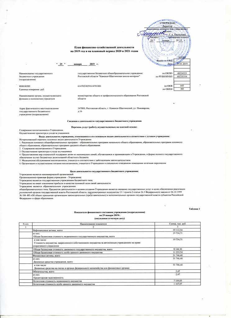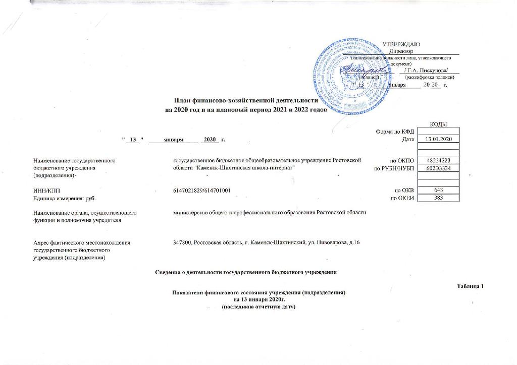 Отчет об исполнении учреждением плана его финансово-хозяйственной деятельности ГБОУ РО "Каменск-Шахтинская школа-интернат"